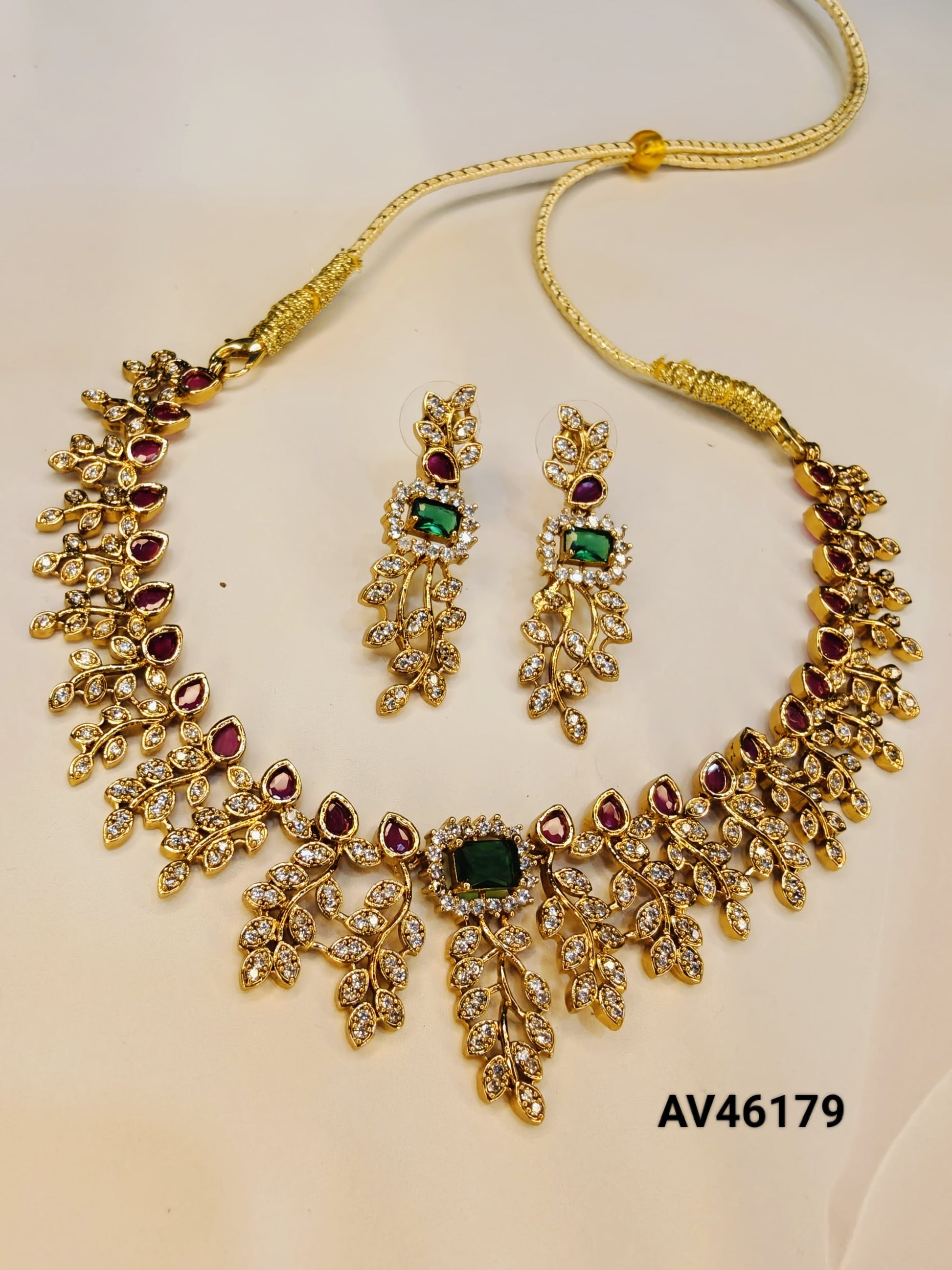 AD Stone Leaf Design Necklace With Pink And Green Stones