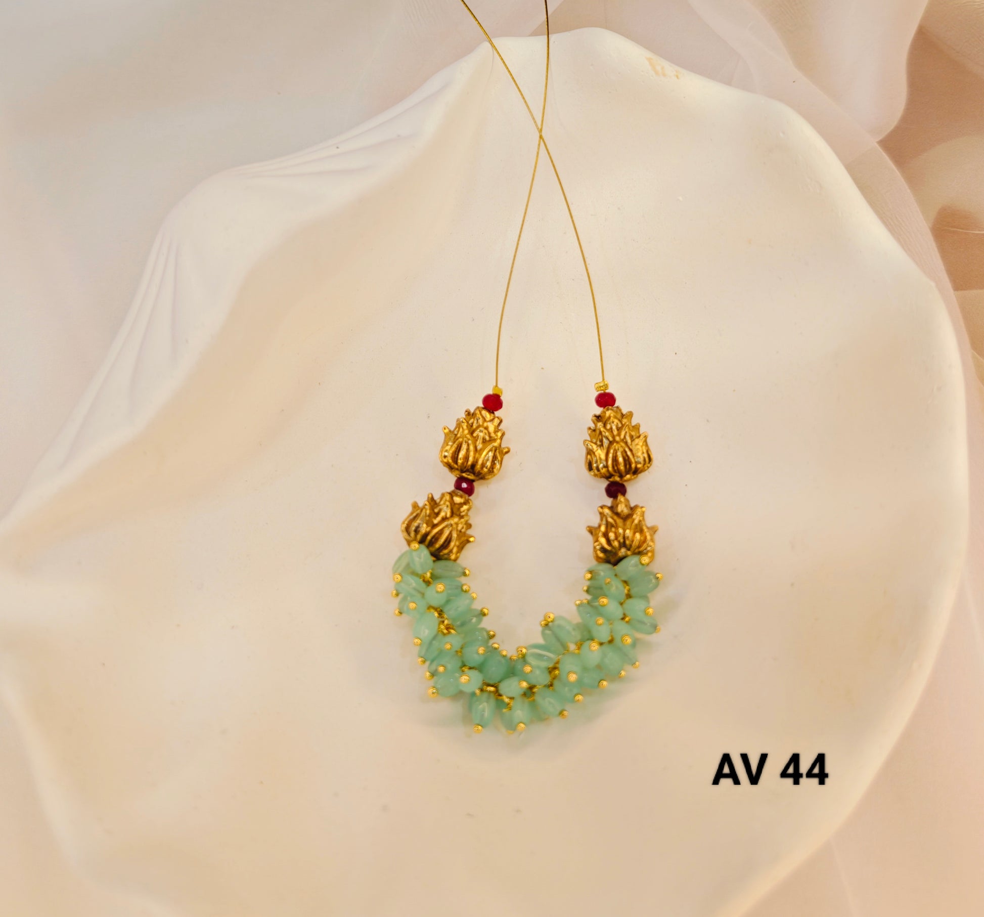 Invisible Set Necklace is designed to create a graceful floating effect that enhances any outfit. The necklace features clusters of soft green beads arranged beautifully at the center, giving it a refreshing and sophisticated look. Golden floral bead accents on either side add a touch of traditional charm, making it a versatile piece that blends modern minimalism with ethnic elegance.