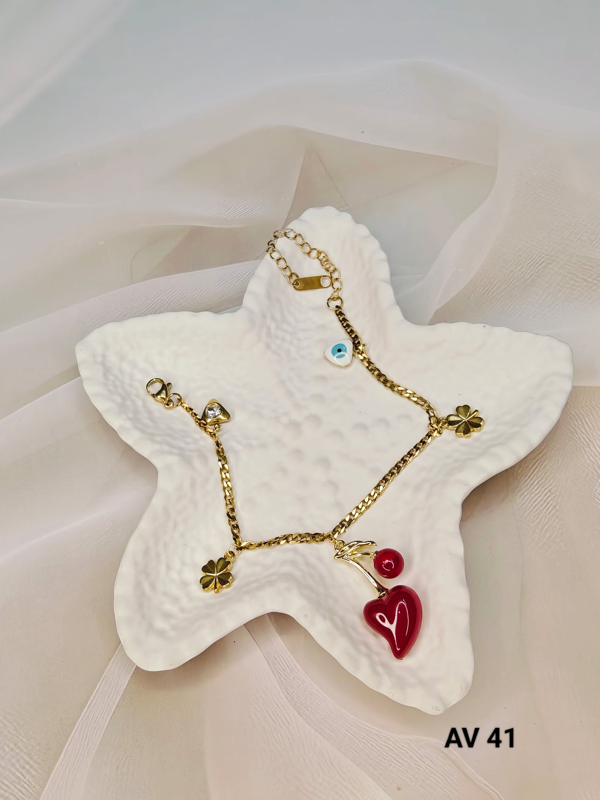 The bracelet features a delicate gold-plated chain adorned with a vibrant red heart charm, a protective blue evil eye, and dainty gold accents for a chic finish. Its lightweight design and adjustable clasp ensure comfort and versatility, making it perfect for everyday wear or special occasions.